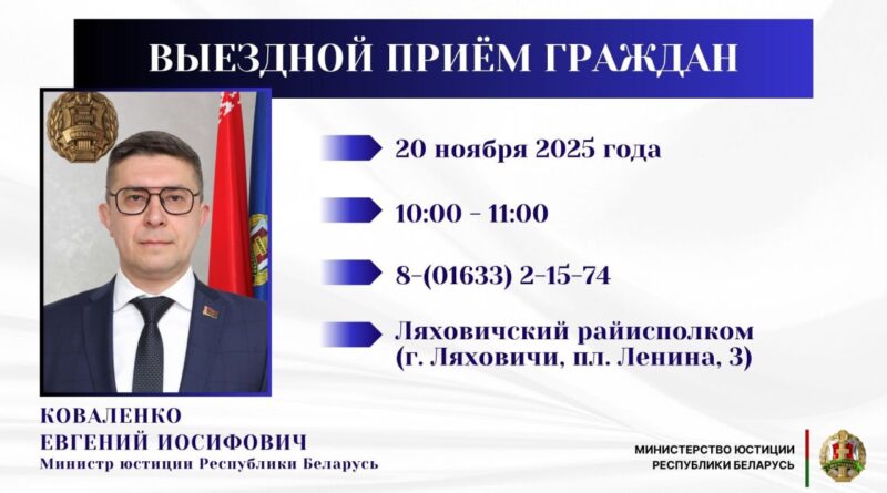 Read more20 ноября 2025 года с 10:00 до 11:00 Министр юстиции Республики Беларусь Коваленко Евгений Иосифович проведет выездной прием граждан в