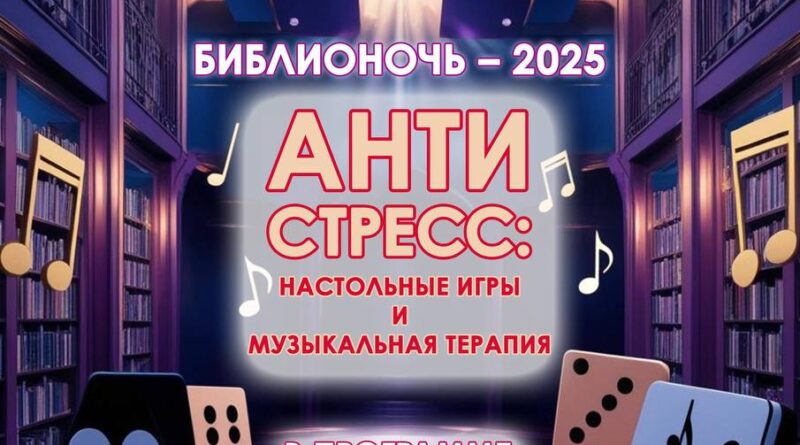 Библионочь «Антистресс: настольные игры и музыкальная терапия» Что вас ждет? 🧃 Уютная атмосфера библиотеки и библиокафе 🧩 Литературные настольные игры