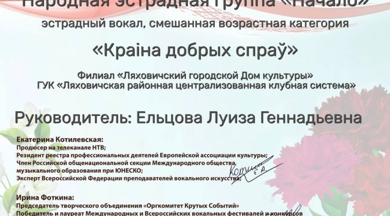 Народная эстрадная группа «Начало» филиала «Ляховичский ГДК» приняла участие в Большом патриотическом фестивале-конкурсе Союзного государства «Звезды мира» (г.Москва). Результат —
