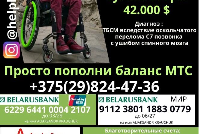 Александр Кравчук из Бреста. В результате травмы у него случился перелом шейного отдела позвоночника. Александр просит о помощи в благотворительном
