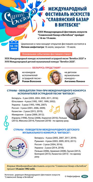 XXIX Международный фестиваль искусств «Славянский базар в Витебске» проходит с 16 по 19 июля. Основными событиями форума станут Международный конкурс исполнителей эстрадной песни «Витебск-2020» и Международный детский музыкальный конкурс «Витебск-2020».