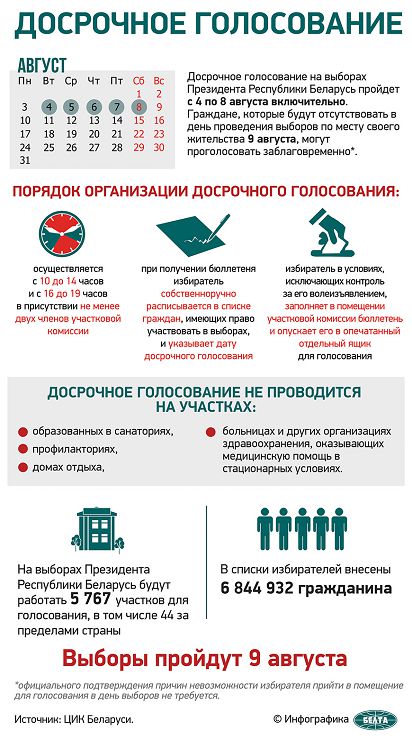 Досрочное голосование на выборах Президента пройдет в Беларуси с 4 по 8 августа включительно. Заблаговременно могут проголосовать избиратели, которые не смогут этого сделать в день проведения выборов 9 августа, сообщает БЕЛТА.