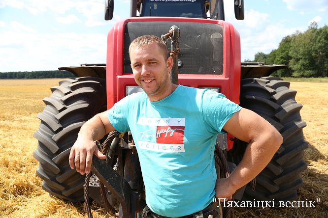 На трактары «МТЗ- 3522» з прычэпам аб’ёмам 18 тон вадзіцель-тысячнік Сяргей Выдрыч за дзень накручвае па хлебным маршруце не менш за дзясятак рэйсаў. Гэта яго першае жніво ў гаспадарцы і адразу, як гаворыцца, у яблычак.