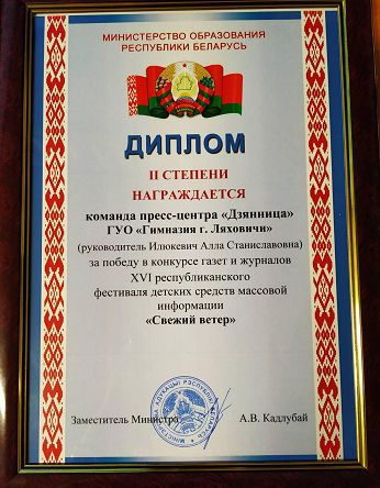 Каманда прэс-цэнтра «Дзянніца» гімназіі ўзнагароджана дыпломам II ступені Міністэрства адукацыі за перамогу ў конкурсе газет і часопісаў XVI рэспубліканскага фестывалю дзіцячых СМІ «Свежы вецер».