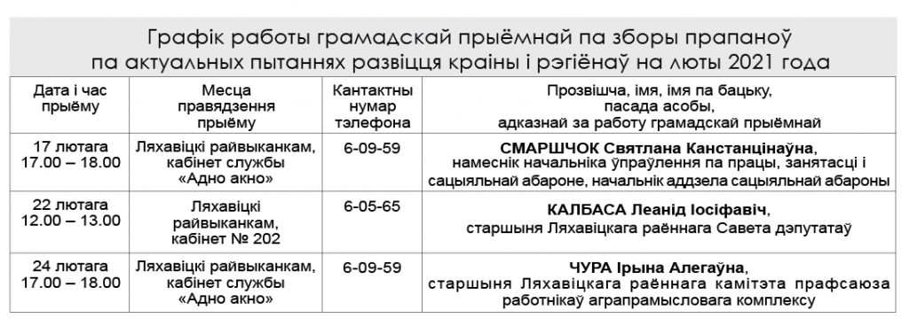 Грамадства Навіны Ляхавічы: графік работы грамадскай прыёмнай на люты 2021 года 16/02/2021 158 redakcyja