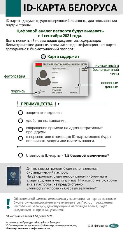 Правовым актом установлены формы бланков биометрических документов, удостоверяющих личность, в виде пластиковой смарт-карты с интегральной микросхемой, содержащей электронное средство биометрической идентификации и криптографический токен аутентификации; для выезда из Беларуси или въезда в страну — в виде паспортной книжки с интегральной микросхемой, содержащей электронное средство биометрической идентификации.