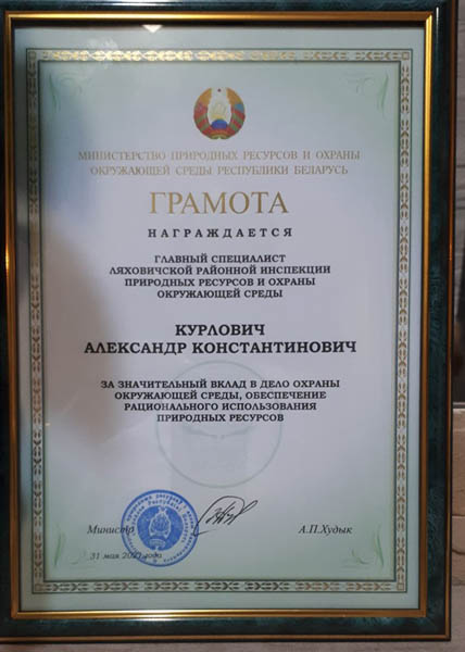 За значны ўклад у справу аховы навакольнага асяроддзя, забеспячэнне рацыянальнага выкарыстання прыродных рэсурсаў Аляксандр Курловіч быў узнагароджаны граматай, якую яму ўручыў міністр прыродных рэсурсаў і аховы навакольнага асяроддзя Рэспублікі Беларусь Андрэй Худык.
