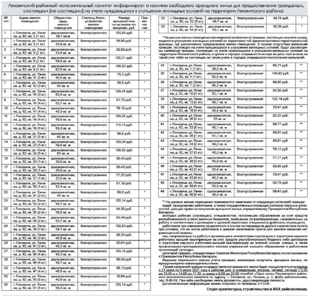 Навіны Ляховичский районный исполнительный комитет информирует о наличии свободного арендного жилья 19/06/2021 590 redakcyja