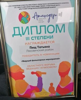 Наша землячка Татьяна Пищ — руководитель клуба «Вечарніца»Новосёлковского СДК завоевала диплом III степени областного форума ведущих «Атмосфера», который прошёл в Бресте.