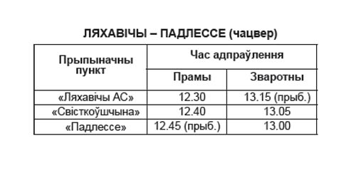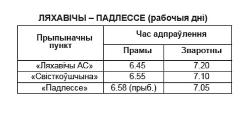 З 9 жніўня па рабочых днях змяняецца час адпраўлення аўтобуса па маршруце Ляхавічы – Вялікае Падлессе, адыход ад аўтастанцыі ў 6.45, ад п. п. «Вялікае Падлессе» ў 7.05.