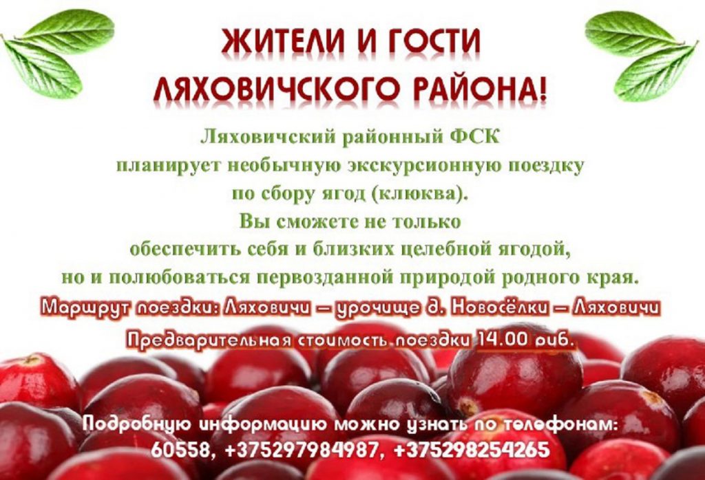 Ляхавіцкі раённы ФСК плануе незвычайную экскурсійную паездку па зборы ягад (журавіны). Вы зможаце не толькі забяспечыць сябе і блізкіх гаючай ягадай, але і палюбавацца некранутай прыродай роднага краю.