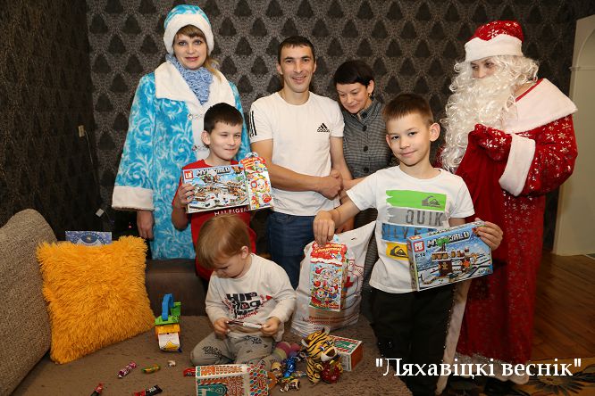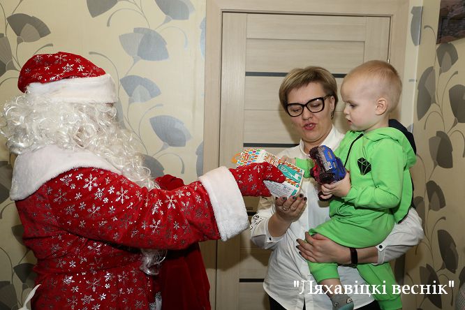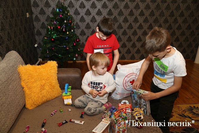 Дзед Мароз і Снягурка, валанцёры Чырвонага Крыжа пабывалі ў мнагадзетнай сям’і ляхавічан Сяргея і Алены Зубікаў, дзе растуць трое дзетак: Мілана, Рома і двухгадовы Жэнька. Яны прымалі падарункі і шчырыя віншаванні. Радаваліся гасцям у сям’і Ігара і Таццяны Карпеяў, якія выхоўваюць Ульяну, Станіслава, Назара і Кліменція.