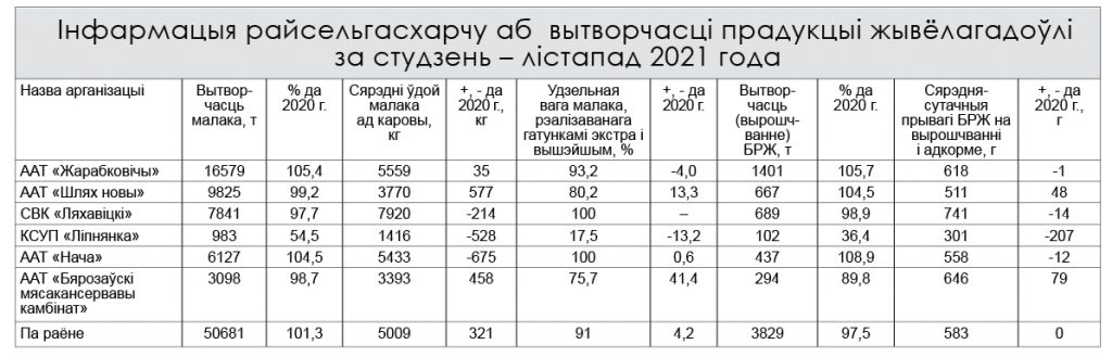 У разрэзе асобных сельскагаспадарчых арганізацый асабліва хочацца адзначыць ААТ «Жарабковічы» і «Нача», у якіх валавая вытворчасць малака за 11 месяцаў ідзе апераджальнымі тэмпамі. Прычым «Жарабковічы» за апошнія пяць месяцаў некаль-