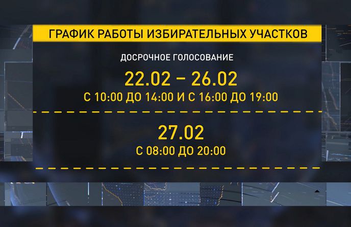 Досрочное голосование стартует 22 февраля и пройдет до 26 включительно. В эти дни избирательные участки будут открыты с 10:00 до 14:00 и с 16:00 до 19:00.