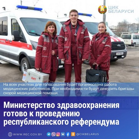 «Усиливаются приемные отделения больничных организаций. Организации здравоохранения обеспечивают готовность к работе в условиях массового поступления пострадавших и выделяются резервные койки по основным профилям в организациях здравоохранения. Также налажено взаимодействие со службами и органами, которые обеспечивают референдум. Таким образом, Министерство здравоохранения готово к проведению республиканского референдума», — констатировали в Минздраве