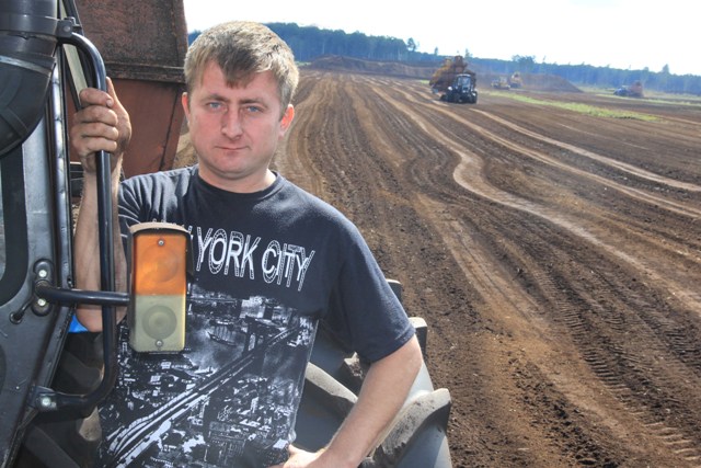 Наш “экскурсавод” — начальнік вытворча-тэхнічнага аддзела Валерый Кандратчык – найперш пазнаёміў з перадавіком штабялюючай машыны Генадзіем Гутырчыкам. Сціплы чалавек, які ледзь паддаўся на ўгаворы сфатаграфавацца для газеты, ужо выканаў 2 сезонныя планы: замест 46 тысяч тон фрэзернага торфу заштабеляваў 93 тысячы тон.