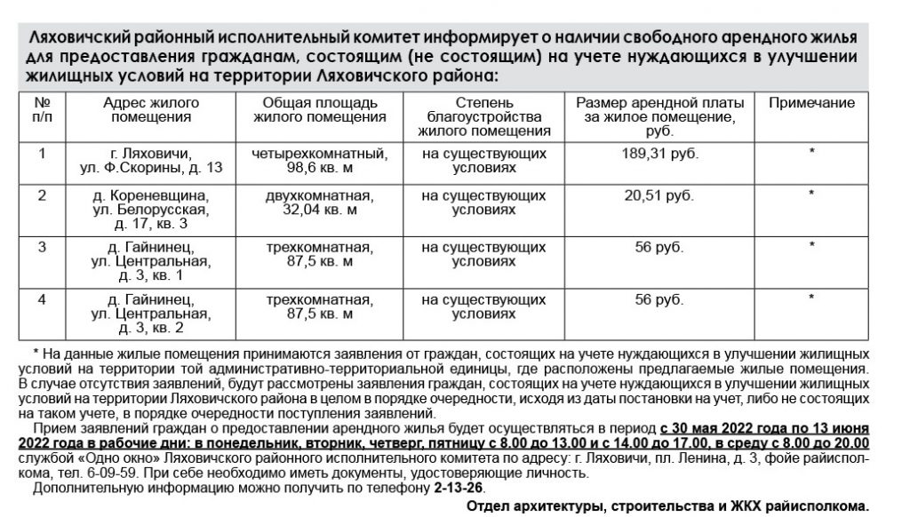 Ляховичский райисполком информирует о наличии арендного жилья