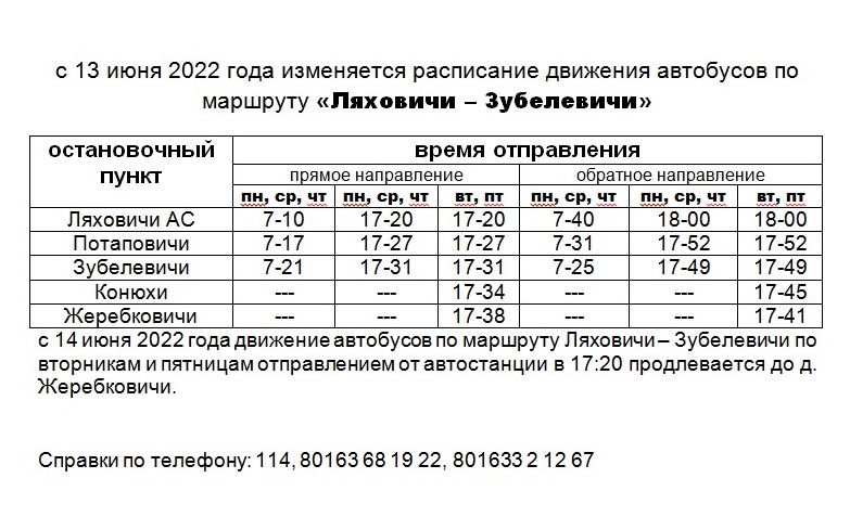 Изменяется график движения автобусов по маршруту Ляховичи-Зубелевичи