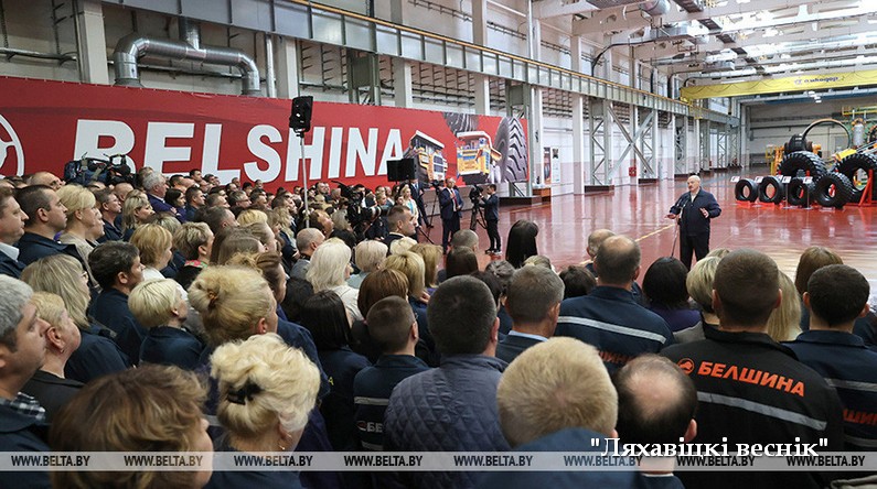 Обстоятельный разговор продолжился и на базе «Белшины», где Президент посетил подготовительный, каландровый и сборочный цеха. В этом году за первые пять месяцев на предприятии было изготовлено более 1,7 млн шин. За январь — апрель на экспорт было поставлено товаров на сумму $8,8 млн, что на 14% больше показателей за аналогичный период прошлого года. Работают здесь более 6,7 тыс. человек. «Кажется, что весь Бобруйск на предприятии работает, — заметил Президент во время общения с трудовым коллективом. — Раньше столько молодых людей здесь не было. Это тоже хорошо. Значит, предприятие смотрит в будущее».