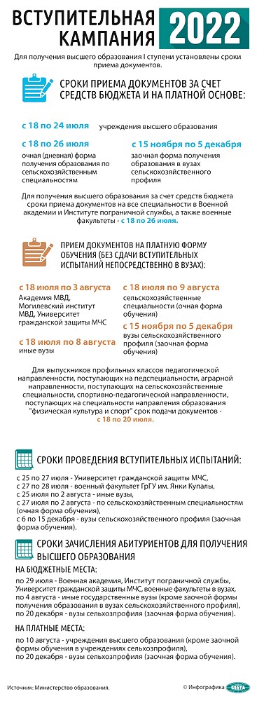 В этом году документы на бюджетные места в вузы можно было подать с 18 по 24 июля. С 25 июля по 2 августа в вузах пройдут внутренние испытания. Зачисление на бюджет завершится 4 августа. Далее идет этап дополнительного набора на обучение за счет средств бюджета с 5 по 7 августа.