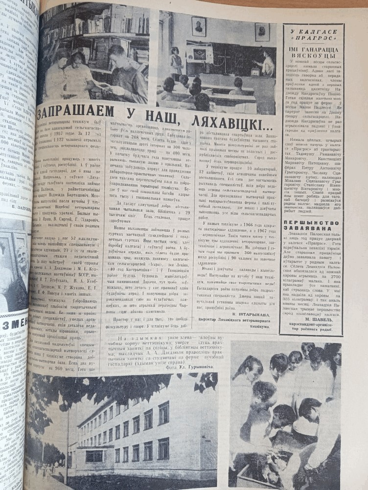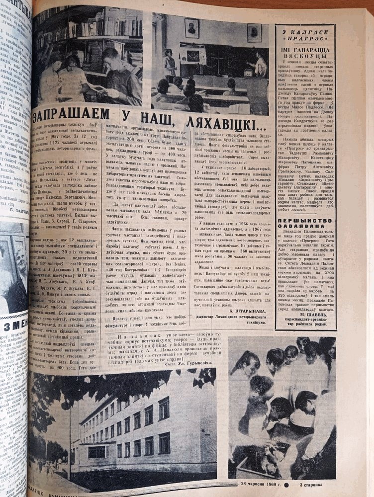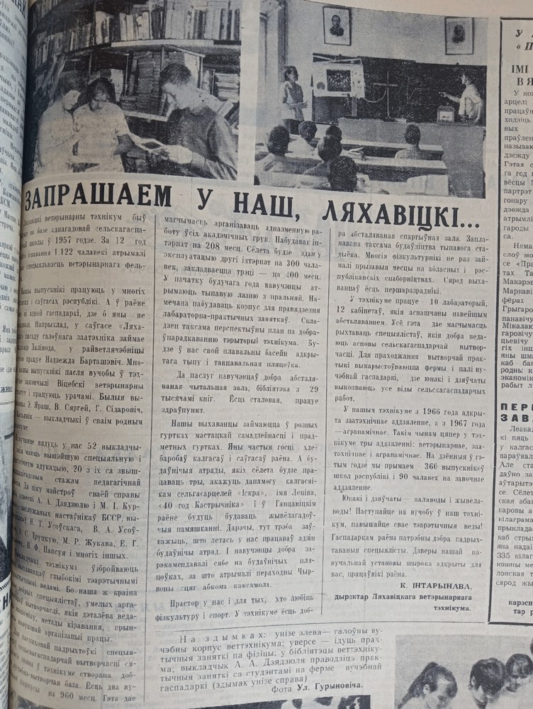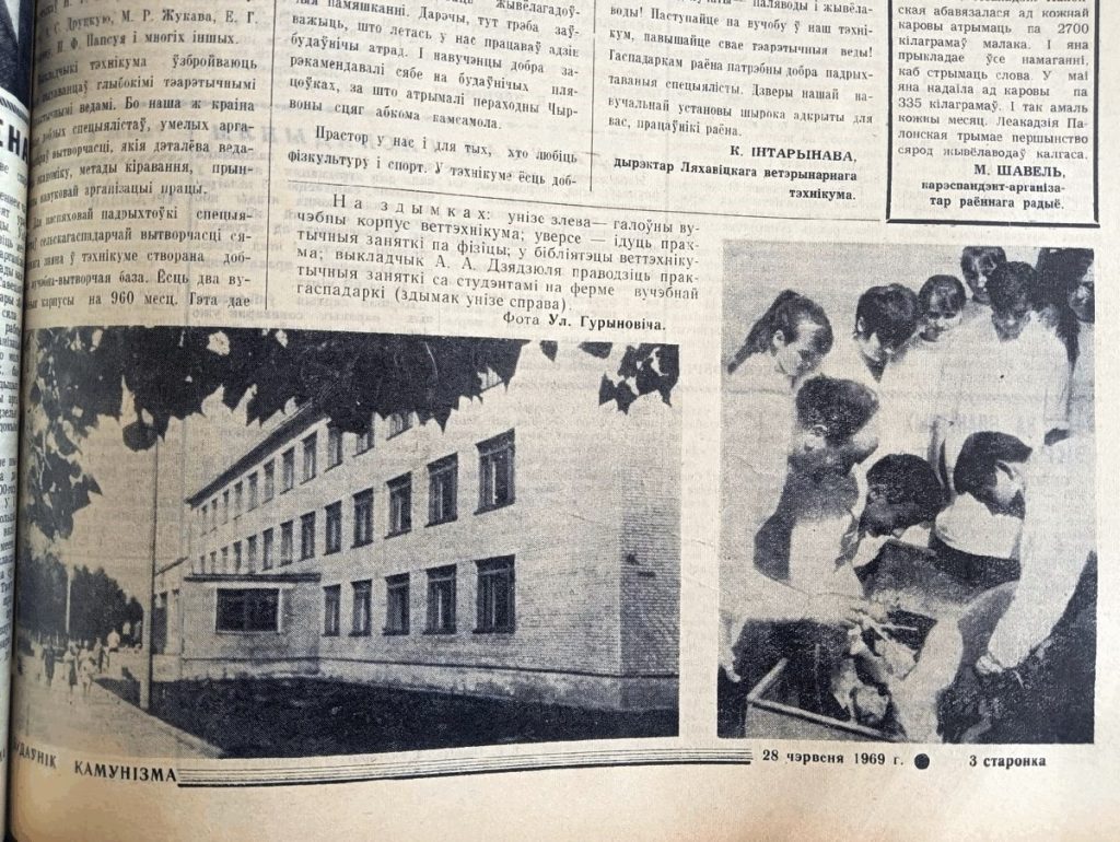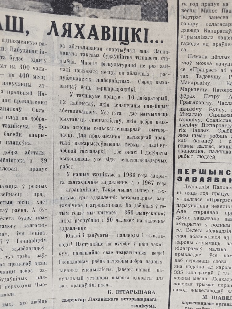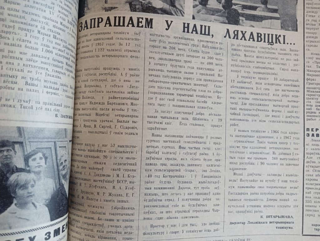 Сердечно поздравляю с 65-летием со дня образования нашего любимого учебного заведения. Какое бы название оно ни носило – школа ветеринарных фельдшеров, ветеринарный техникум, Ляховичский совхоз-техникум, аграрный колледж, обособленное подразделение «Ляховичский аграрный колледж» Барановичского государственного университета – его отличают молодость духа и энтузиазм сотрудников, уважение к традициям, стремление шагать в ногу со временем, желание приносить пользу нашей Родине, любовь к подрастающему поколению.