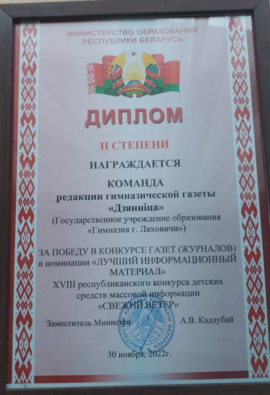 Команда редакции гимназической газеты «Дзянніца» (ГУО «Гимназия г. Ляховичи») стала победителем в номинации «Лучший информационный материал».