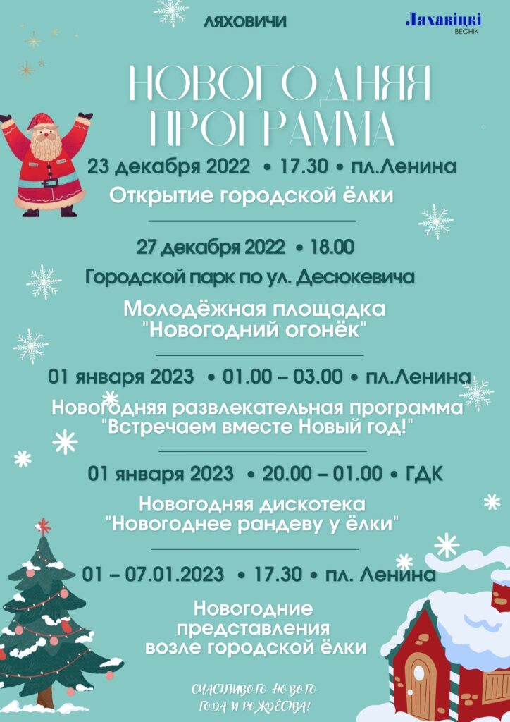 Навіны Внимание! В Ляховичах в новогодней программе произошли изменения 09/12/2022 154 redakcyja Молодёжная площадка «Новогодний огонёк» будет работать 27 декабря