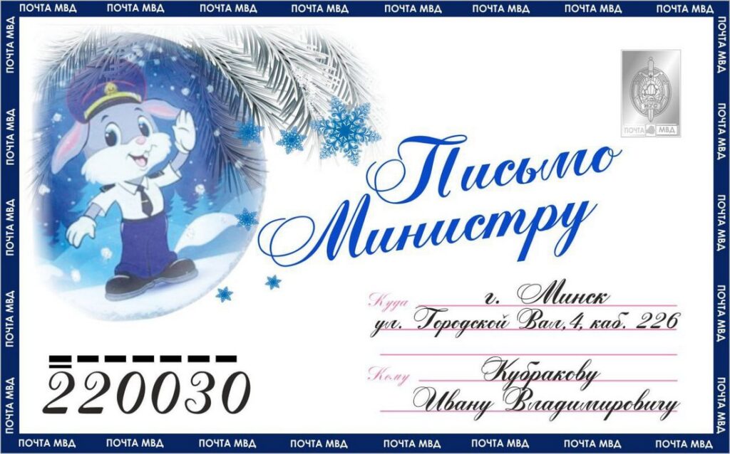 Для гэтага напішы пісьмо міністру ўнутраных спраў Кубракову Івану Уладзіміравічу. Прышлі яго па пошце ў МУС з 19 па 26 снежня ўключна.