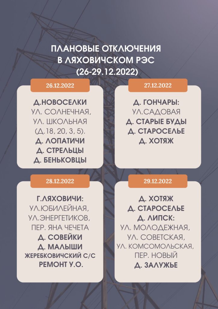Навіны Где в Ляховичском районе 26-29 декабря планово отключат электроэнергию? 25/12/2022 247 redakcyja