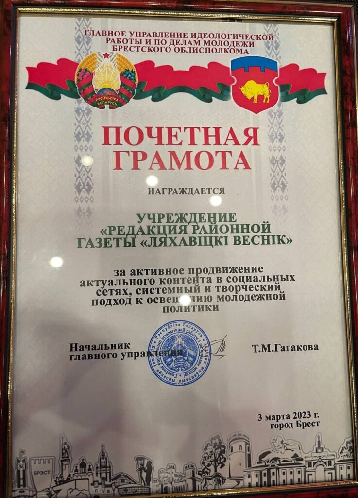 По итогам работы редакция районной газеты «Ляхавіцкі веснік» отмечена Почётной грамотой главного управления идеологической работы и по делам молодёжи Брестского облисполкома.