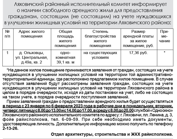 Навіны Ляховичский районный исполнительный комитет информирует о наличии свободного арендного жилья 21/01/2023 58 redakcyja