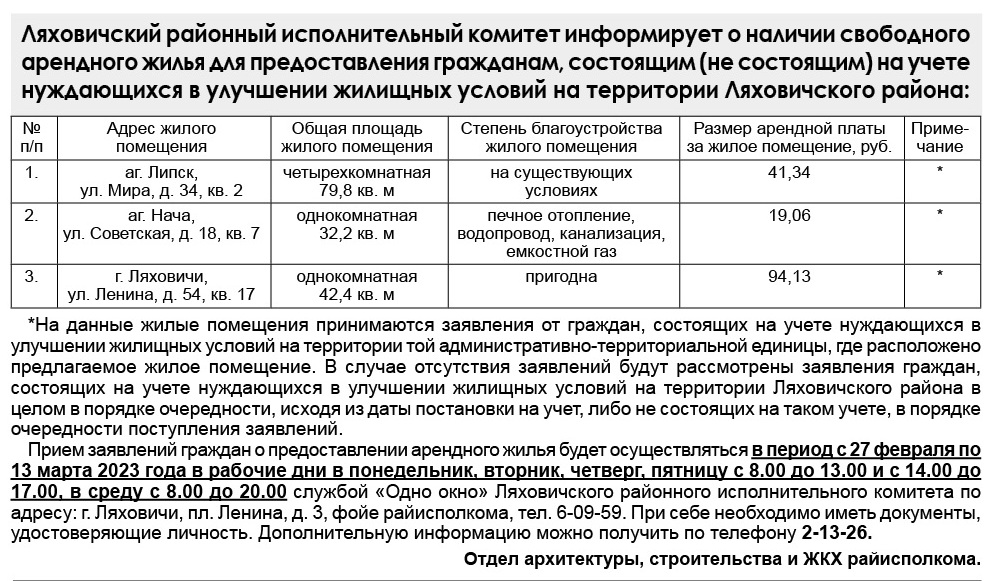 Навіны Ляховичский районный исполнительный комитет информирует о наличии свободного арендного жилья для предоставления гражданам 25/02/2023 60 redakcyja