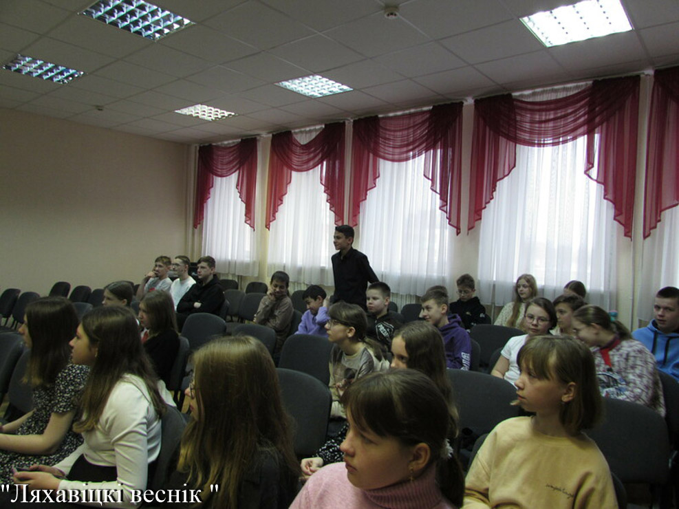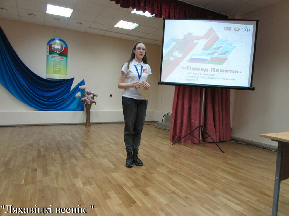 В шестой школьный день в Центр дополнительного образования детей и молодежи г.Ляховичи были приглашены члены пионерских дружин учреждений образования города. В рамках Республиканского проекта ОО «БРПО» «Встречи на все 100!» и реализации мероприятий Центра патриотического воспитания здесь прошла встреча-диалог с участницей первого белорусско-российского патриотического культурно-образовательного проекта «Поезд Памяти» Викторией Новицкой.