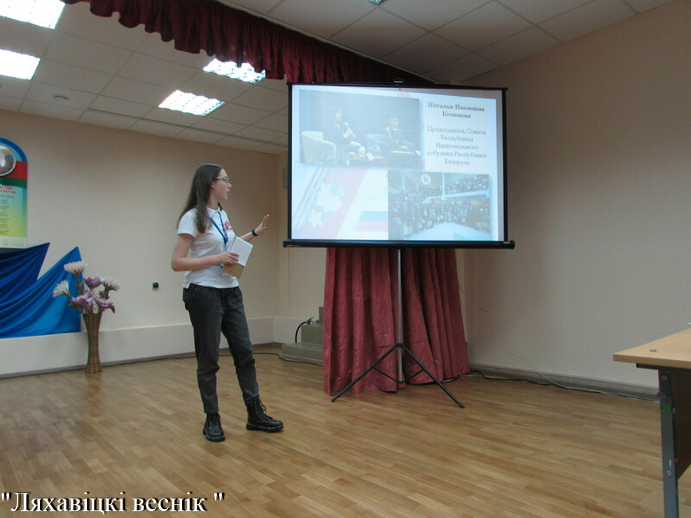 Виктория – учащаяся 11 класса средней школы №1 г.Ляховичи, отличник учебы, секретарь первичной организации ОО «БРСМ», многократный победитель и призер различного уровня конкурсов, олимпиад, проектов, член волонтерского отряда «Чистые сердца», активный участник общественной жизни. Виктория рассказала ребятам о своем участии в проекте «Поезд Памяти», поделилась впечатлениями и подчеркнула значимость данного проекта для юного поколения.