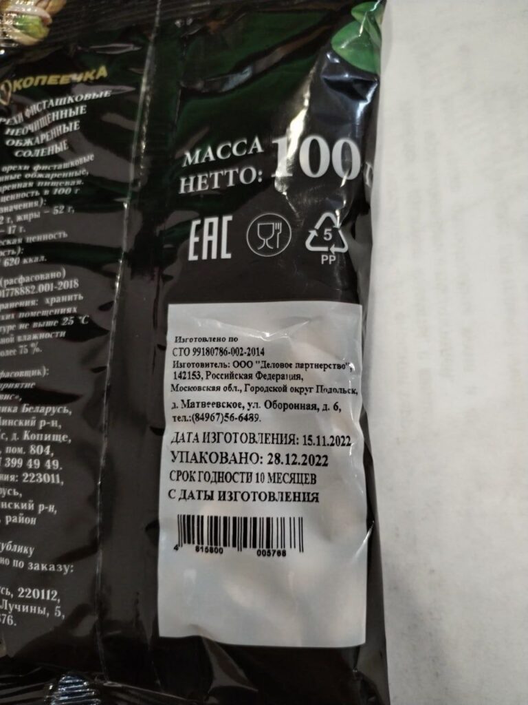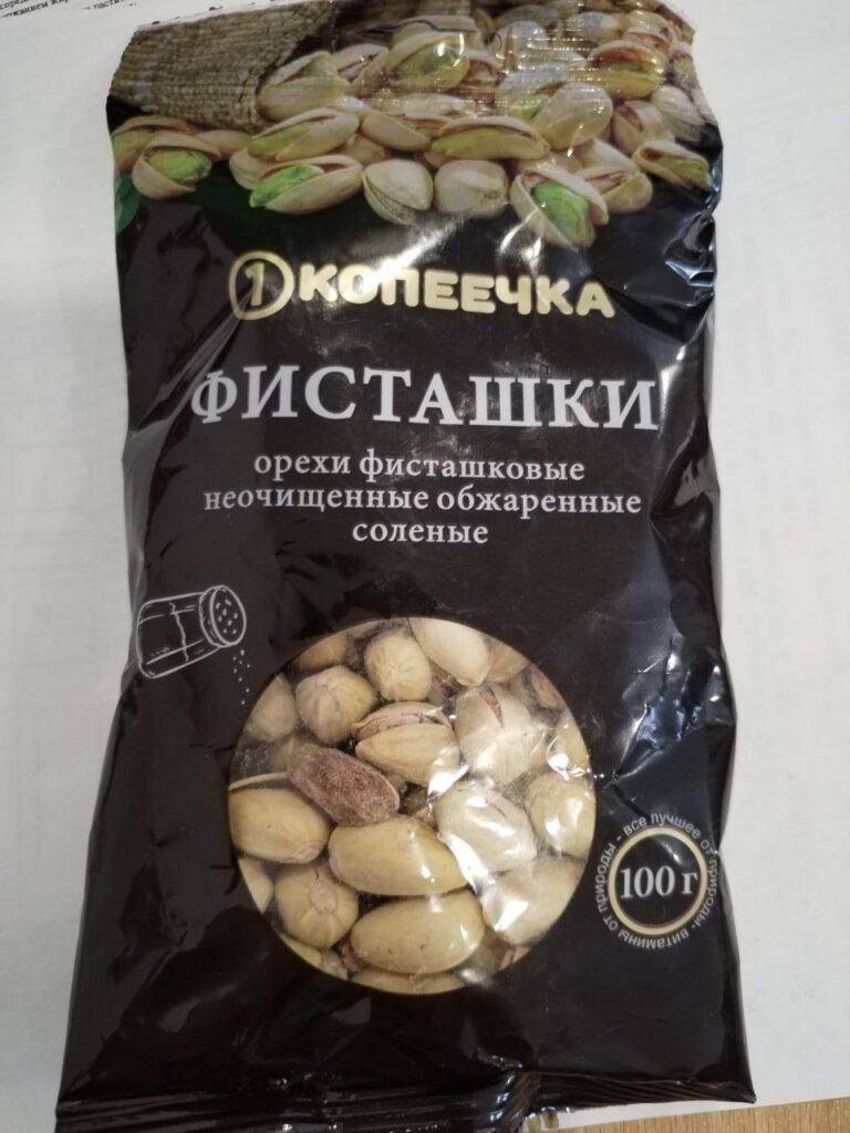 фисташки торговой марки КОПЕЕЧКА, орехи фисташковые неочищенные обжаренные соленые, дата изготовления 15.11.2022, упаковано 28.12.2022, срок годности 10 месяцев с даты изготовления; изготовитель: ООО «Деловое партнерство», 142153, Российская Федерация.