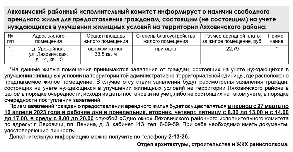 Навіны Ляховичский районный исполнительный комитет информирует о наличии свободного арендного жилья 27/03/2023 142 redakcyja