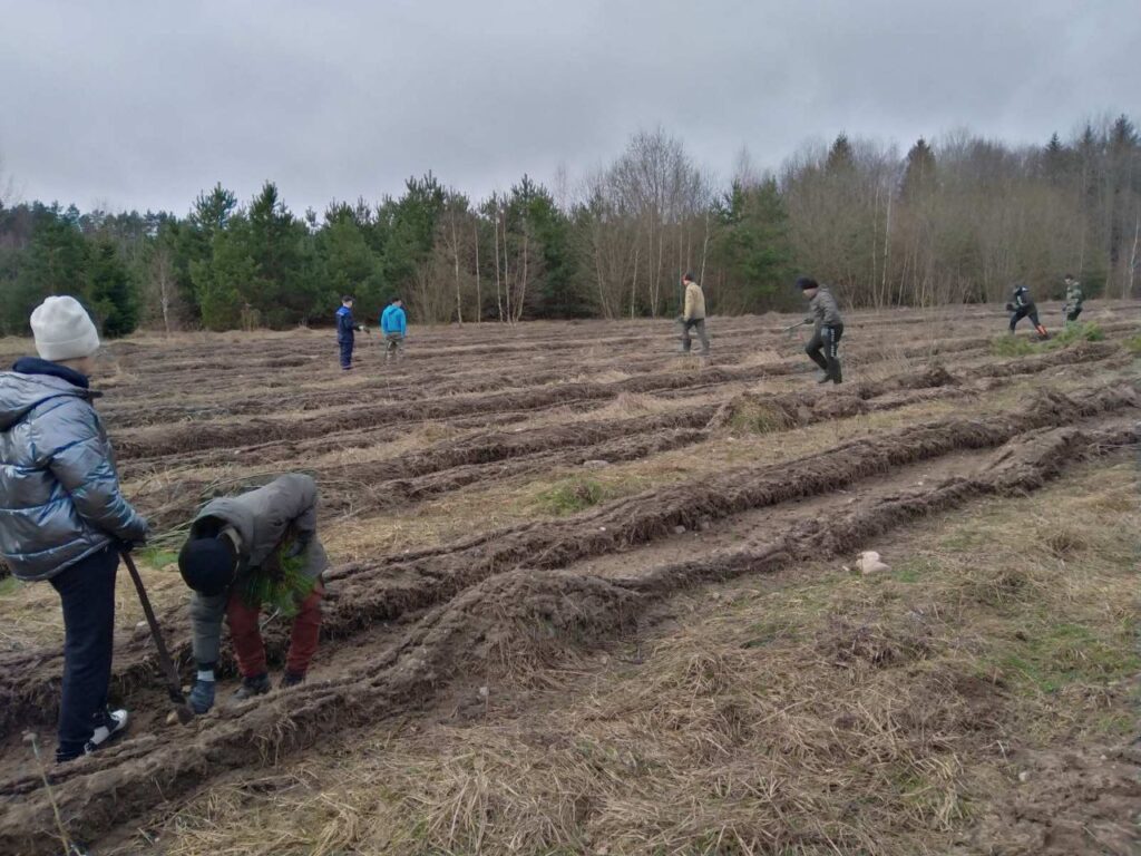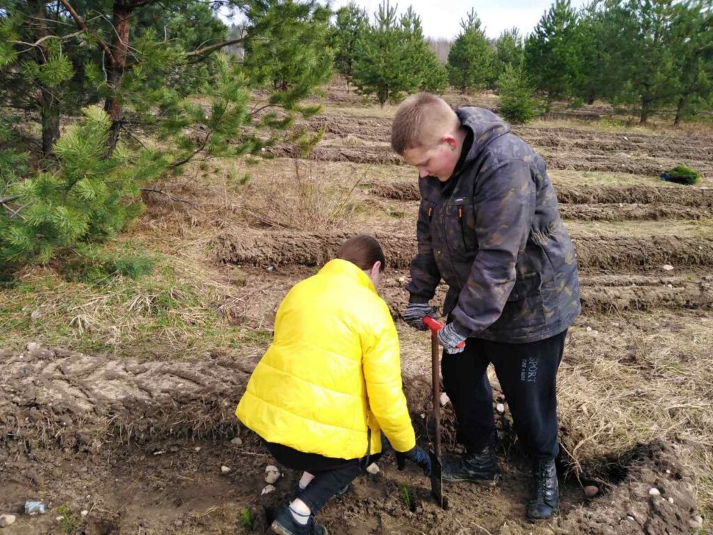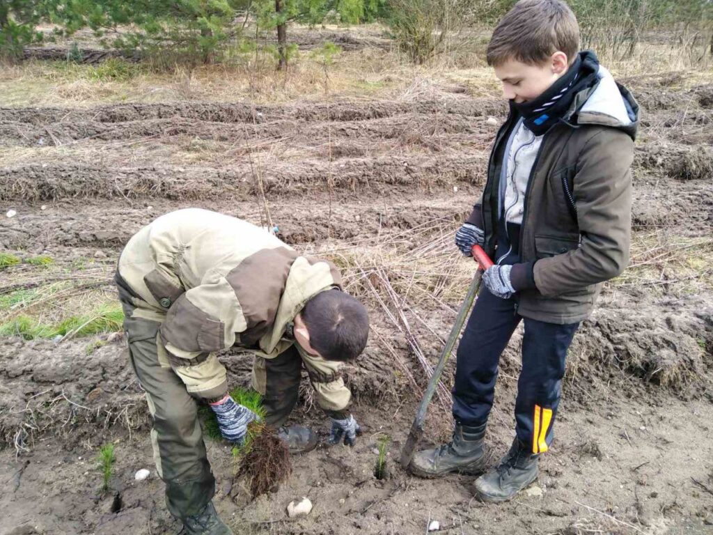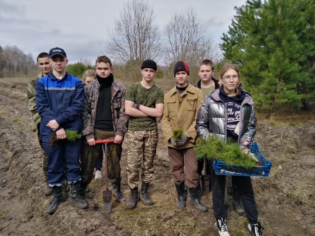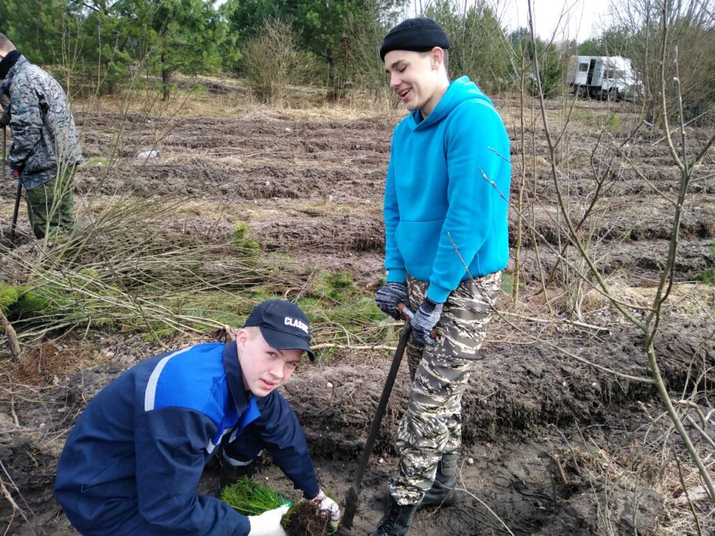В Туховичской СШ на весенних каникулах работает студотряд. Ребята занимаются посадкой леса.