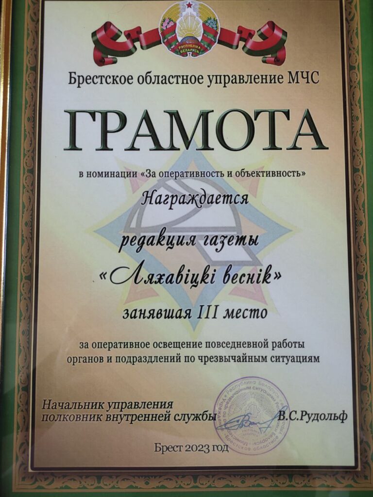 В номинации «За оперативность и объективность» редакции газеты «Ляхавiцкi веснiк» присуждено 3 место.