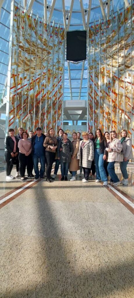 Накануне Дня Победы экскурсанты также посетили Музей истории Великой Отечественной войны. Ребята осмотрели 11 экспозиционных залов, которые тематически можно разделить на три блока: довоенная жизнь, военный период и послевоенное время. Все залы находятся друг за другом, в которых можно совершить своеобразное путешествие во времени, полностью ощутив атмосферу войны. В этом, к слову, помогали не только экспонаты и визуальное оформление залов, но и звуковые эффекты. Например, зал «Дорога войны» включала танки, самоходные артиллерийские установки, гаубицы, грузовые автомобили военных лет, танковый таран, а под потолком расположилась воздушная битва. Грозная, мощная техника заставляла пораженно застыть. При входе в зал с помощью манекенов иллюстрирован момент нападения: стоит командир вместе с артиллеристом, на заднем фоне — беженцы. Возле них оригинальная 45-миллиметровая противотанковая пушка и машина ГАЗ-А, которую в народе называют «полуторка». В небольшой импровизированной землянке с подсветкой экскурсанты увидели отдельные экспонаты самодельного партизанского оружия, которые были разработаны мастерами в полевых условиях и не имеют аналогов. Пройдя все экспозиции музея, которые отражают величайшую трагедию, члены профсоюза вышли к светлому залу Победы. По всему периметру – тысячи фамилий Героев Советского Союза и полных кавалеров ордена Славы, названия воинских частей и соединений, участвовавших в освобождении нашей земли от немецко-фашистских захватчиков. Все это свидетельства того, что современное поколение помнит о тех страшных временах, героях, сражениях и победах. Зал вызывает сильнейшее чувство гордости за людей, которые одержали Победу.