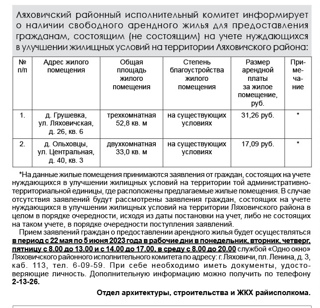 Навіны Ляховичский районный исполнительный комитет информирует о наличии свободного арендного жилья 20/05/2023 243 redakcyja