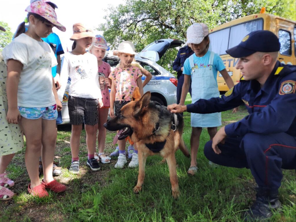 С большим интересом ребята наблюдали за служебно-розыскной собакой по кличке Дейзи, которая беспрекословно выполняла команды, подаваемые голосом и жестами своего милиционера-кинолога. А младший четвероногий сотрудник Лорд продемонстрировал навыки в задержании условного преступника. Ребята узнали, что почётная служба даётся нелегко, ведь на работе собаки часто рискуют сильнее, чем их коллеги-люди.