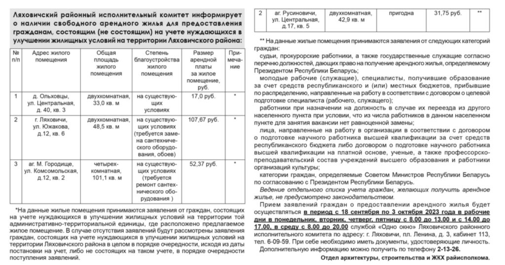 Навіны Ляховичский районный исполнительный комитет информирует о наличии свободного арендного жилья 16/09/2023 126 redakcyja