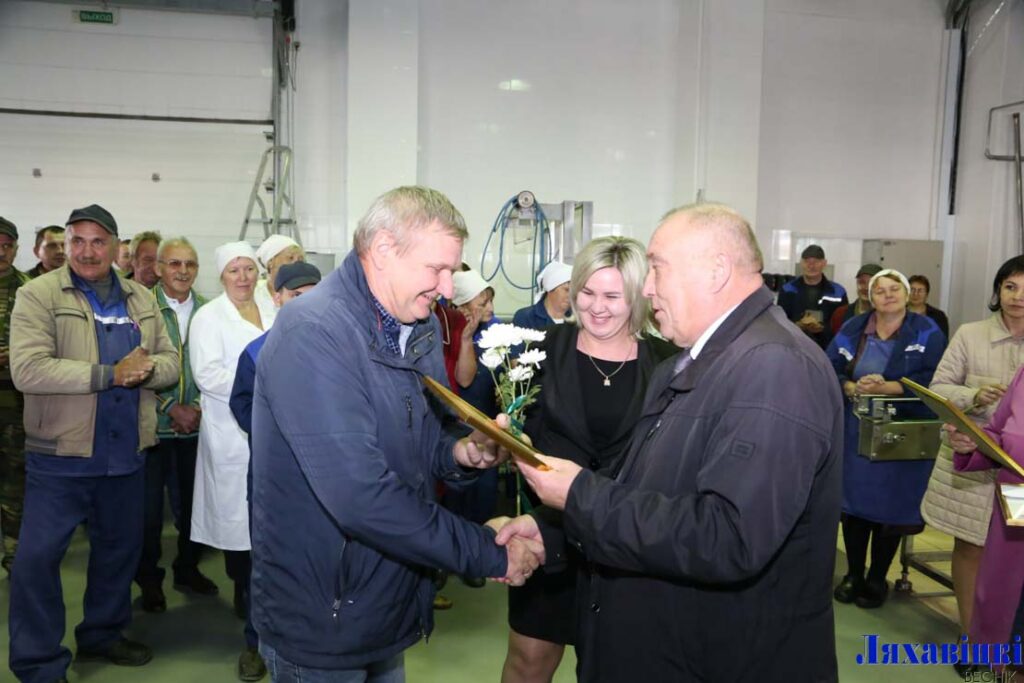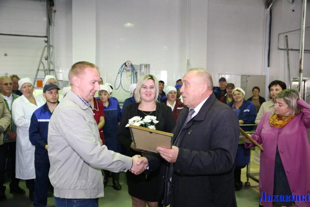 Руководитель отраслевого профсоюза встретился с коллективом предприятия, вручил профсоюзные награды и подарки работникам консервного завода, в том числе нагрудный знак Белорусского профсоюза работников АПК «За заслуги» — директору ОАО «Ляховичский консервный завод» Александру Вощуку.