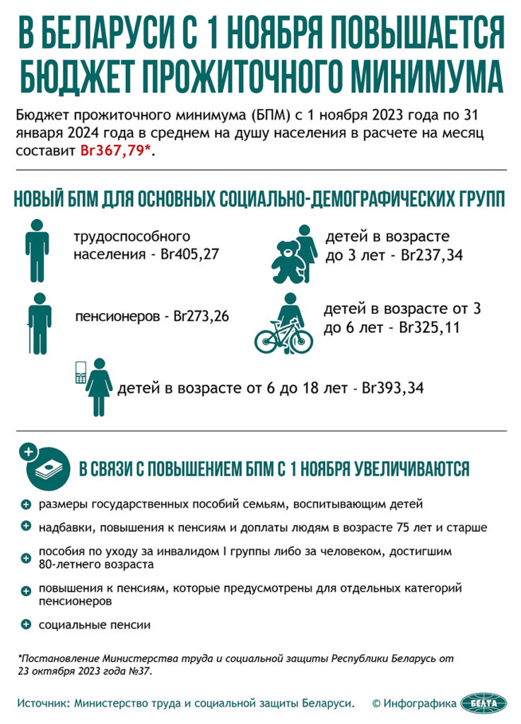 Постановлением Министерства труда и социальной защиты Республики Беларусь от 23 октября 2023 года №37 на период с 1 ноября 2023 года по 31 января 2024 года утверждены новые размеры бюджета прожиточного минимума (БПМ) в среднем на душу населения и по основным социально-демографическим группам.