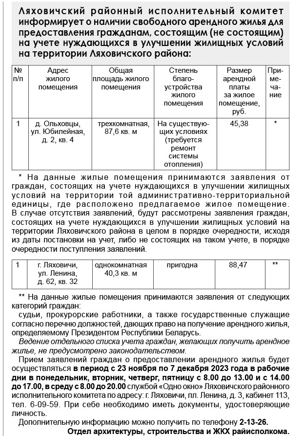 Грамадства Навіны Ляховичский районный исполнительный комитет информирует о наличии свободного арендного жилья 22/11/2023 397 redakcyja