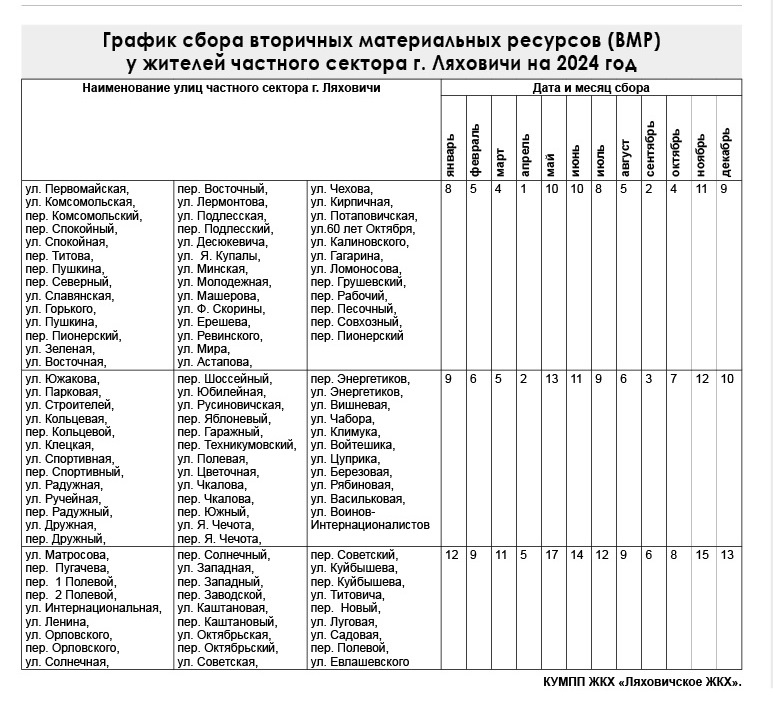 Навіны График сбора вторичных материальных ресурсов (ВМР) у жителей частного сектора г. Ляховичи на 2024 год 09/01/2024 465 redakcyja