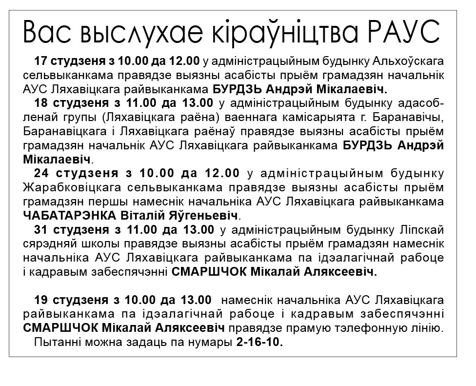 Вас выслухае кіраўніцтва Ляхавіцкага РАУС
