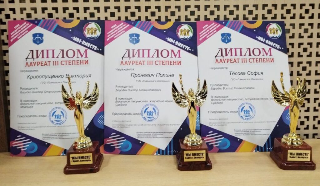 Участницы вокального ансамбля «Иллюзия» гимназии г. Ляховичи Виктория Кривопущенко, Полина Проневич и София Тёсова отмечены дипломами лауреатов III степени ( учитель музыки Бородко Виктор Станиславович)