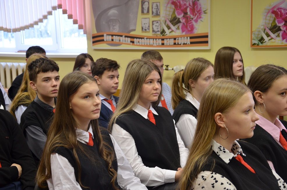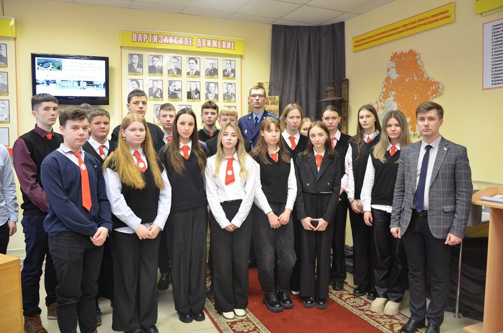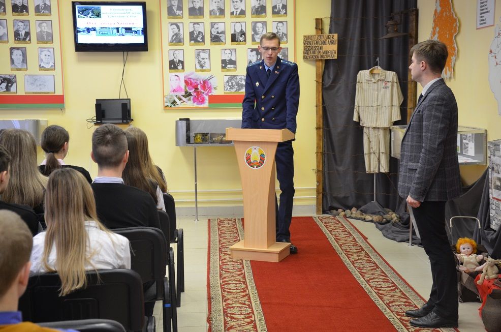 На уроке в 10 «А» классе, который прошел в музее «Боевой и трудовой славы», присутствовал помощник прокурора Ляховичского района Е.Л.Вильковский, который познакомил ребят с ходом расследования уголовного дела по факту геноцида белорусского народа в годы Великой Отечественной войны, рассказал о поисковых мероприятиях, которые проводятся вблизи урочища Уручье под Минском.