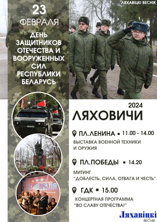 Навіны Ляховичи: программа мероприятий ко Дню защитников Отечества и Вооружённых Сил Республики Беларусь 22/02/2024 213 redakcyja
